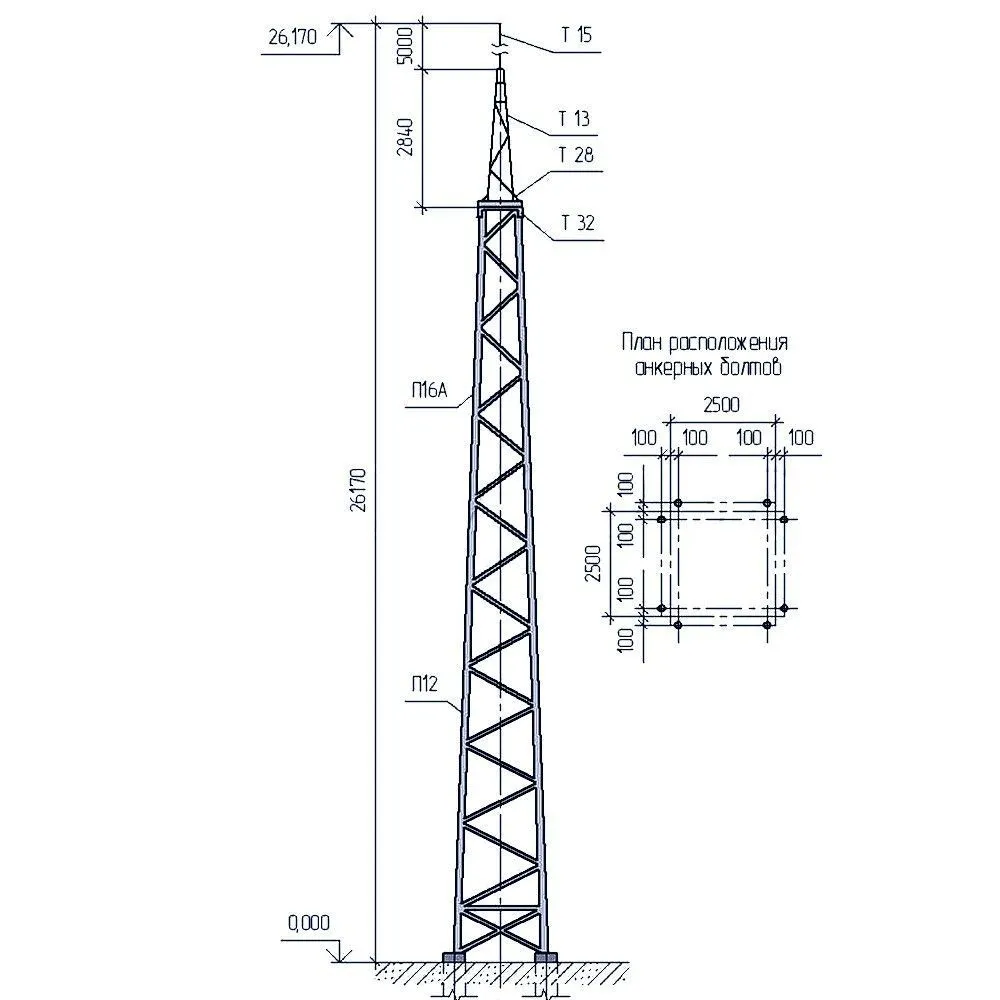 - Ствол: Секции из углового проката, соединённые болтовыми узлами