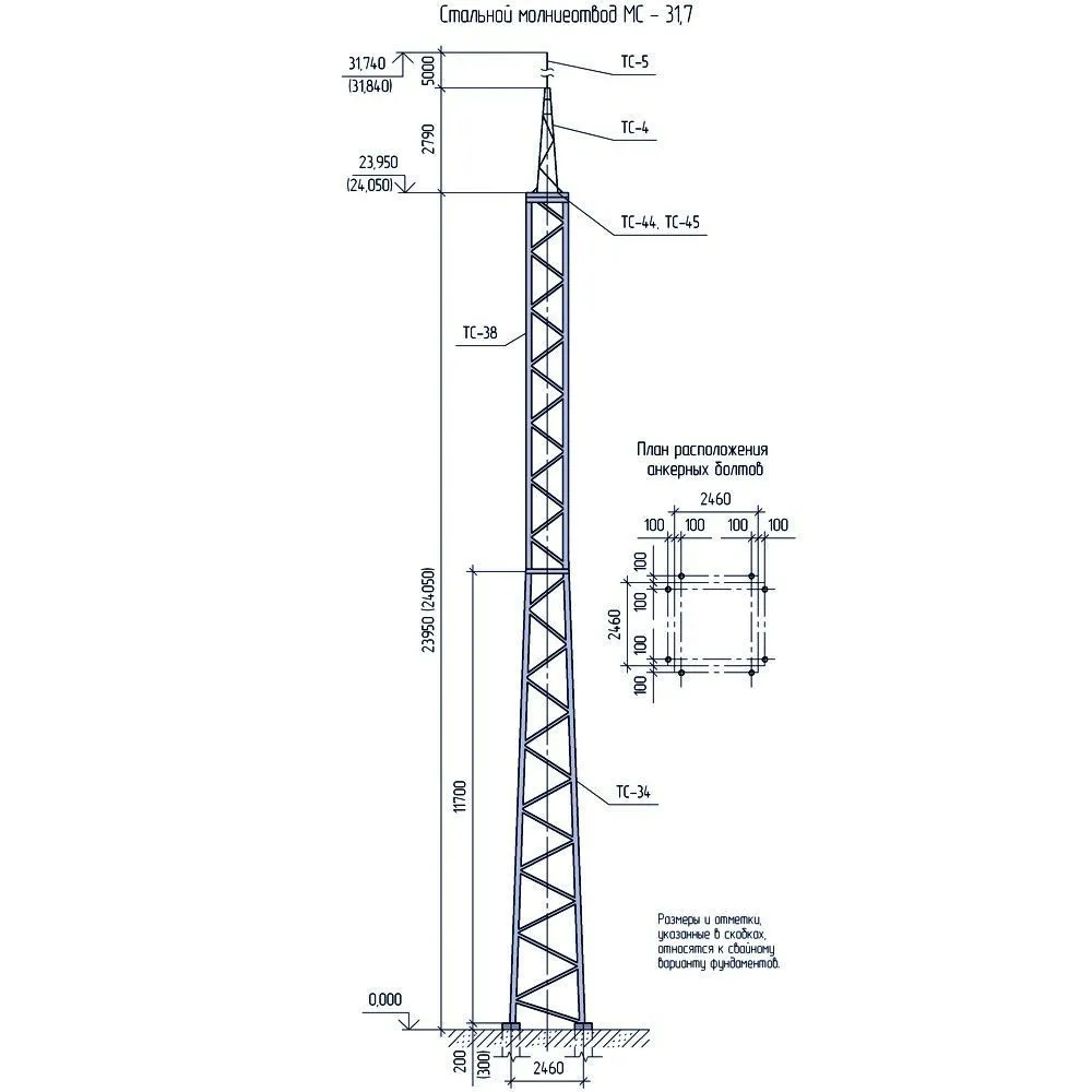 Молниеотвод стальной МС-31,7 — отдельно стоящая конструкция для молниезащиты открытых распределительных устройств (ОРУ). Изготавливается по серии 3.407.9-172 из углового проката.